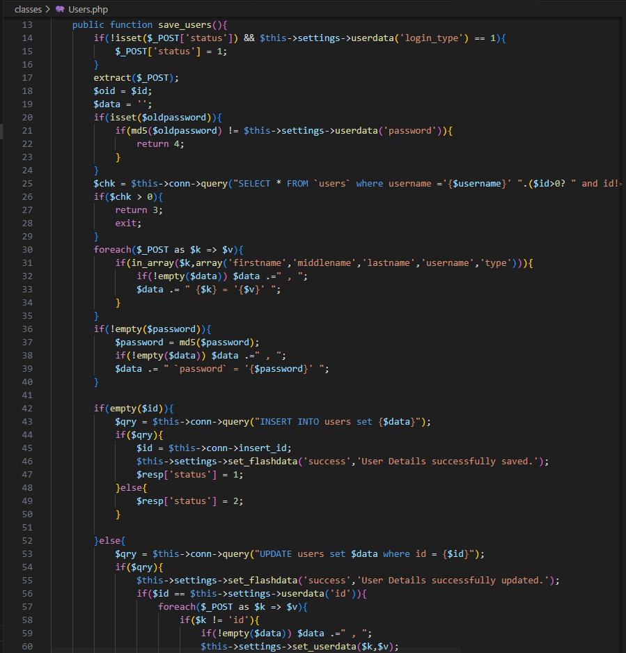 Upon examining the classes/Users.php file, which handles user management operations, I detected that the save_users function is executed without any authentication checks.